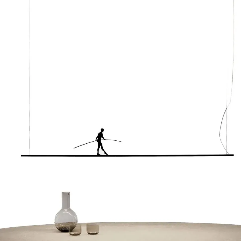 Lampada a sospensione in metallo di colore nero costituita da barra led da cm 150. Luce led 26,5 Watt 3300 lumen colore luce 3000K luce calda-naturale Completa di cavo, di alimentazione e rosone a soffitto in acciaio cromato. Sistema illuminante di particolare design con profilo led ed elemento decorativo figura funambolo. Indicato per illuminare sopra il tavolo e utilizzabile anche in coppia. Disponibile in expo. dimensioni cm 150 x 20 H mc. 0,01 – Kg. 4