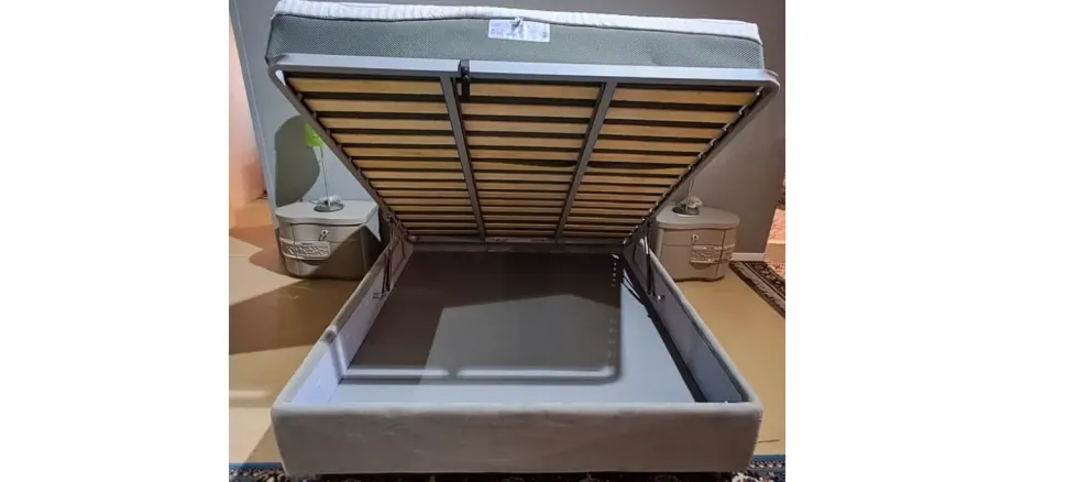 Letto matrimoniale contenitore, rivestimento Microfribra parzialmente sfoderabile, piedini in legno.