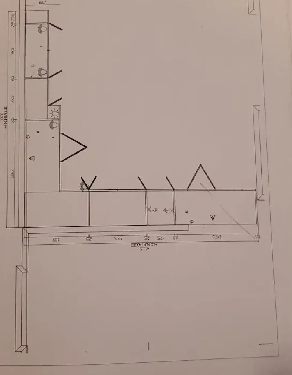 La composizione ad angolo misura cm. 411,5 x 387,8 x 263,6 altezza.