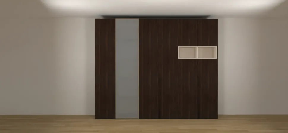 Armadio lineare mod. Plana versione con maniglia w . Un’ anta modello murano in finitura palladio anta in vetro specchio trasparente argento. Tutto in essenza rovere borgogna, interno melaminico rovere borgogna. Vano a giorno con angoli a 45 gradi in finitura seta opaco.