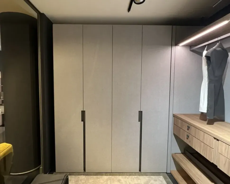 Armadio battente con ante in finitura gurè; maniglia col. moka shine; interni in finitura gesso con cassettiera 3 cassetti e raster.