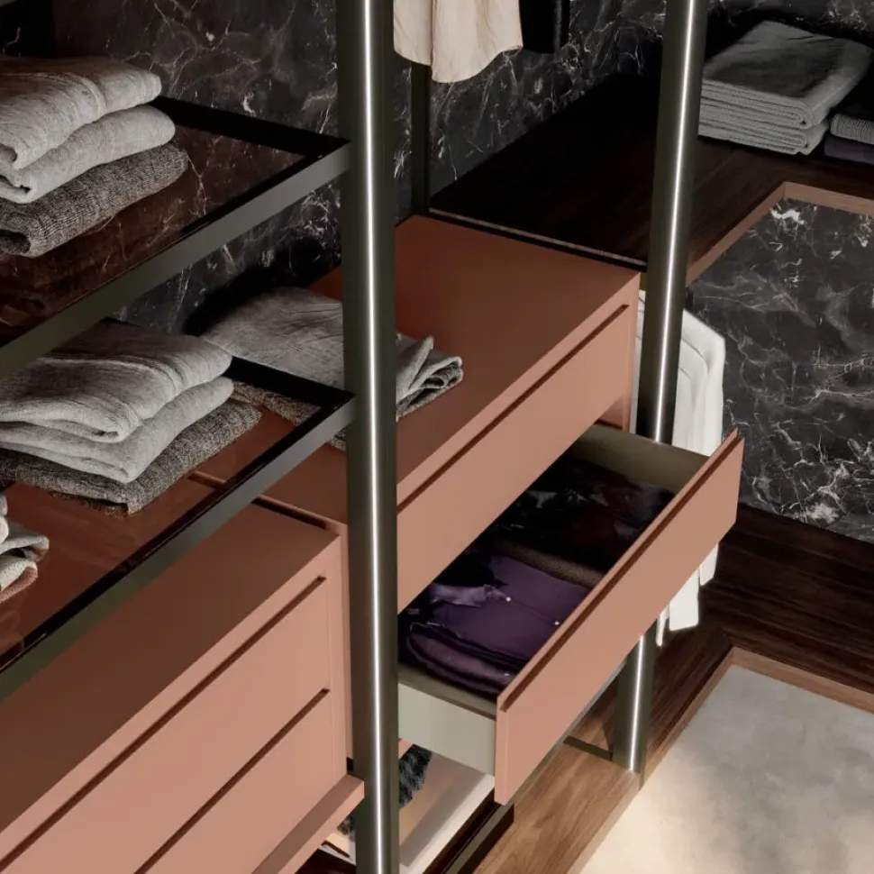 - All’interno dell’armadio Cabina armadio skeletro, esempio di versatilità e praticità, non possono mancare mai vari accessori essenziali: è ultimato con un’ampia cassettiera interna, studiata per ottimizzare la contenitività della struttura.