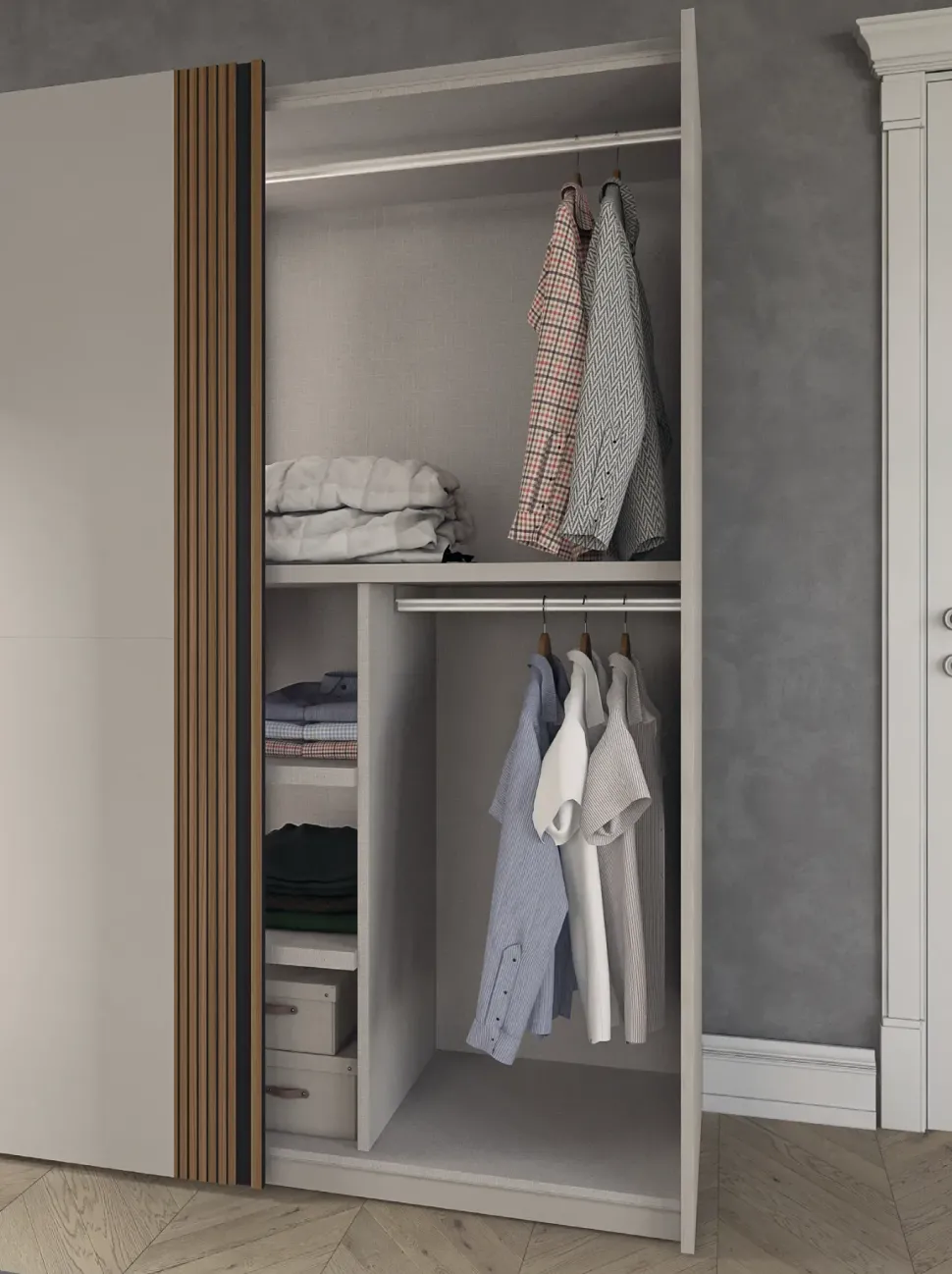 - **Specchi interni:** Se vuoi comprare sistemi con specchi da accostare a questo armadio, dovrai richiederli direttamente a noi e potrai ottenerli con un supplemento, dato che questa proposta non include nessuno specchio.