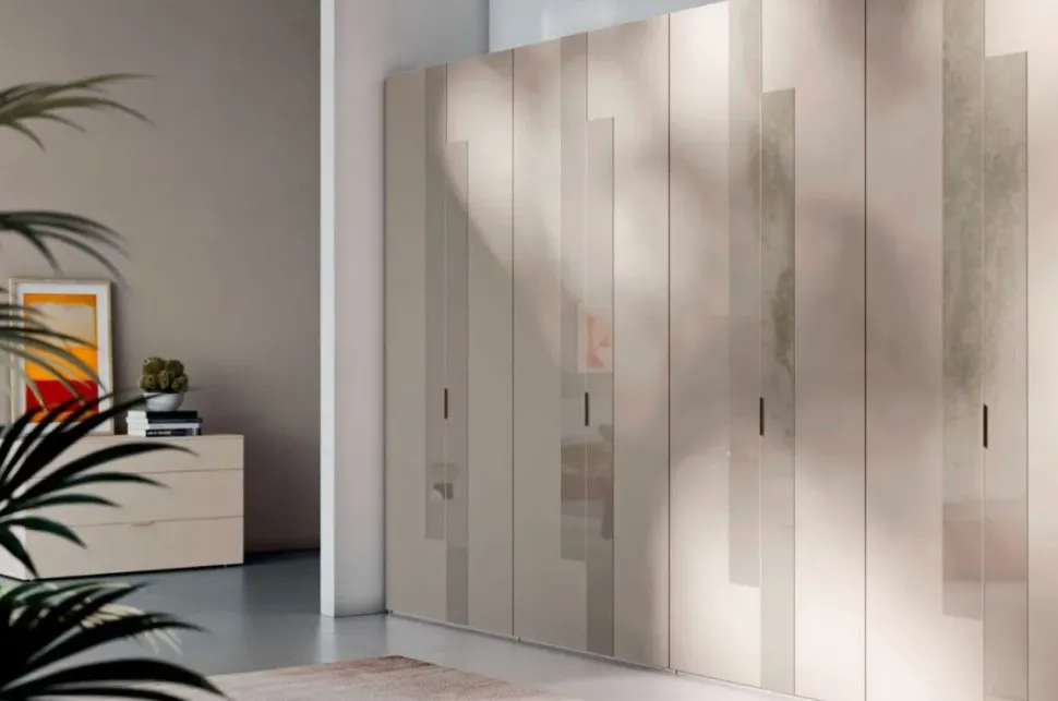 Finiture: melaminico Tortora con fasce verticali in Vetro laccato tortora e maniglia Crea laccata Tortora