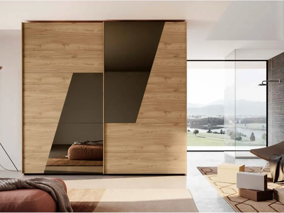 Armadio composto da due ante L.135 cm con finitura in noce biondo e si puo’ aggiungere una maggiorazione intarsio trapezoidale in specchio bronzo