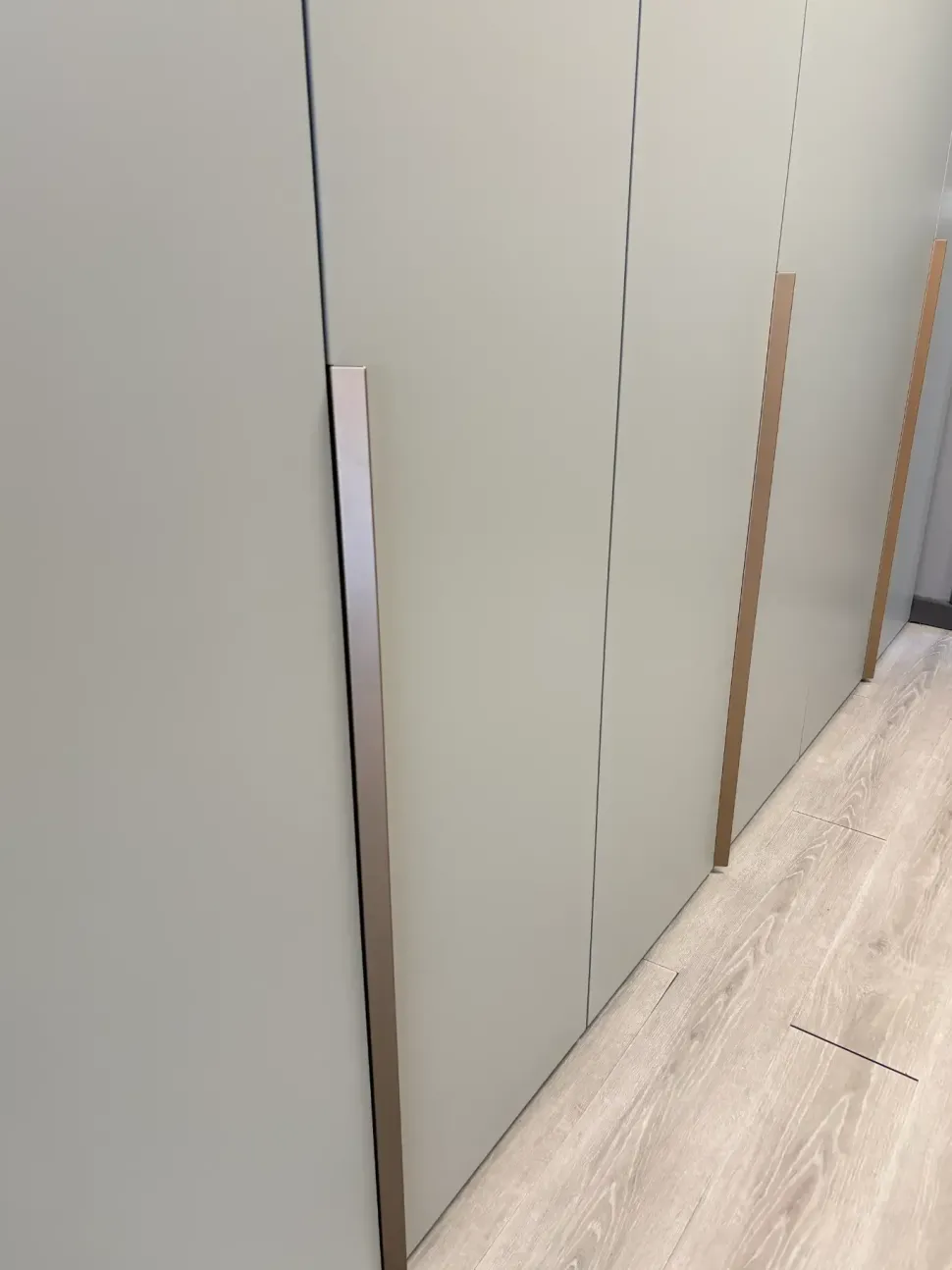 Armadio San Giacomo modello anta Battente con maniglia Ala in finitura Bronzo metal , finitura esterna laccato Juta opaco , finitura interna olmo materico medio .