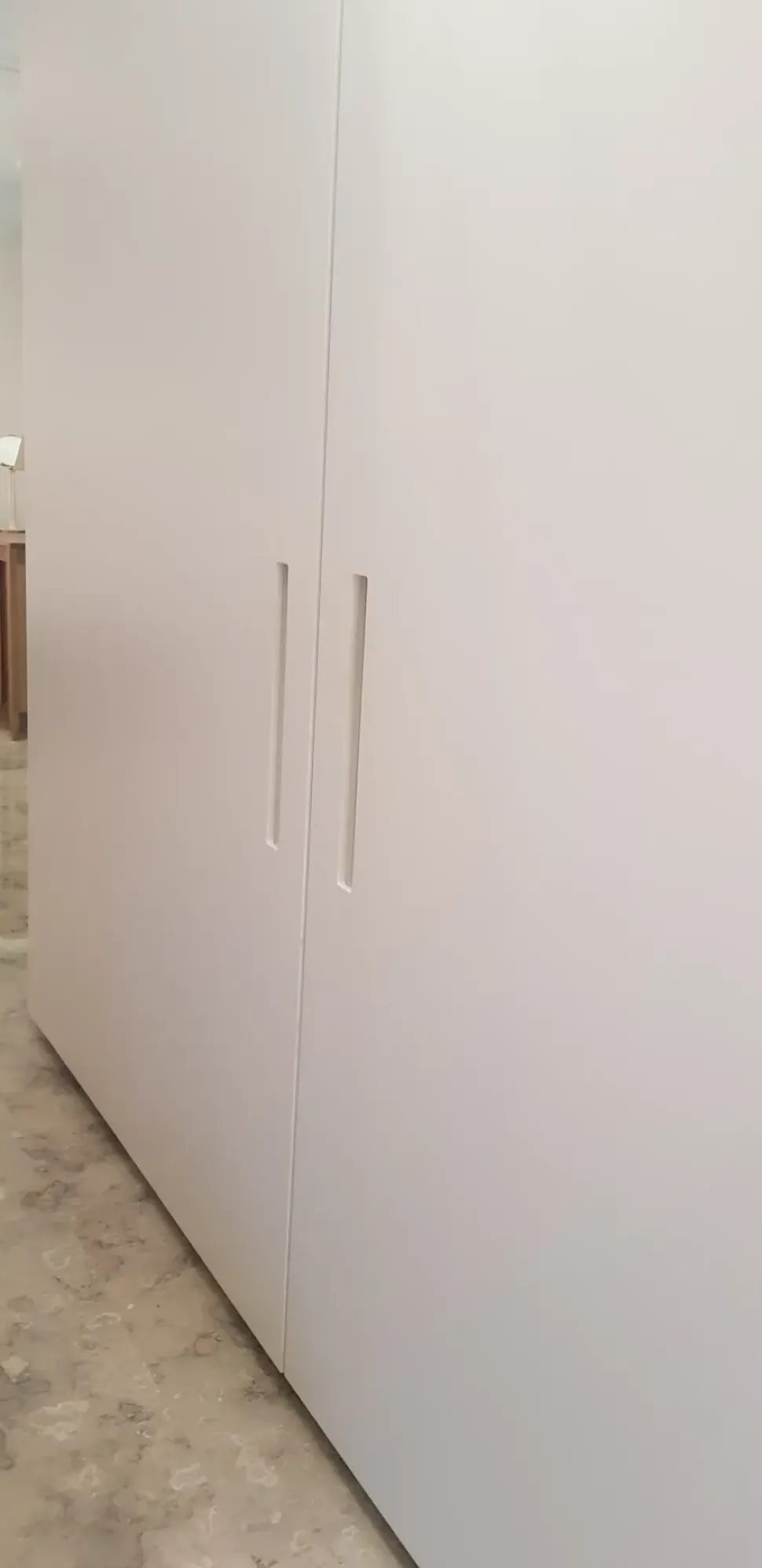 L’armadio ad ante scorrevoli in finitura laccata opaca, LCT carta, presenta un sofisticato sistema di apertura a compasso che permette di allineare le ante complanari disponendole su unico piano, offrendo il vantaggio estetico di una superficie perfettamente continua, priva di sporgenze e rientranze. Anche la maniglia verticale ricavata nello spessore dell’anta è un elemento caratterizzante di questo armadio, con possibilità di realizzarla tono su tono o in contrasto.