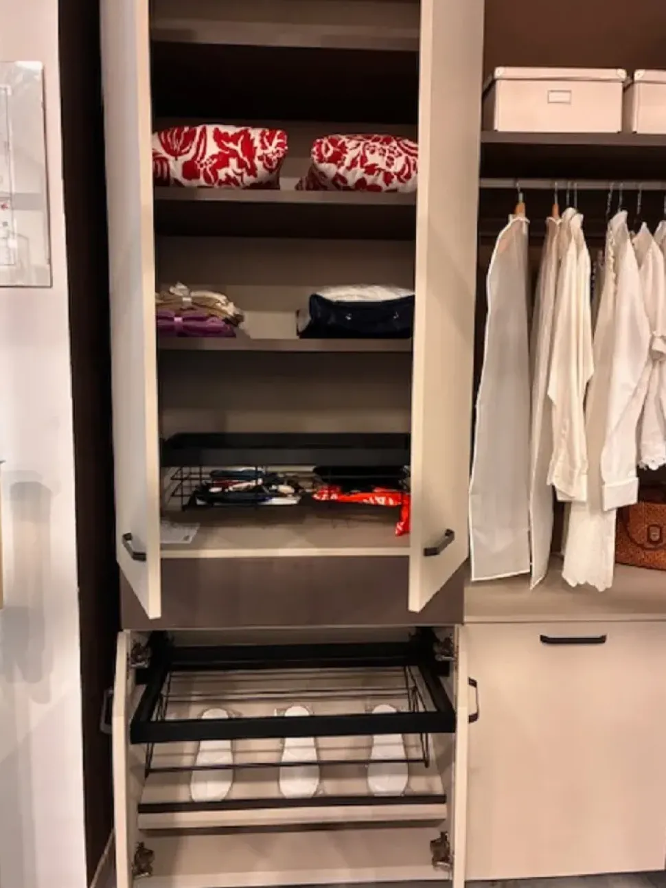 Partendo da sx modulo da 90 con parte sotto attrezzato con portascarpe e tavolo da lavoro estraibile, parte sopra ripiani e cesto estraibile. Modulo centrale da 90 parte sotto attrezzata con cesto estraibile porta biancheria e parte sopra vano aperto con tubo appendiabiti, sulla dx modulo cm 120 p.73 con vano per lavatrice e asciugatrice e ripiani.