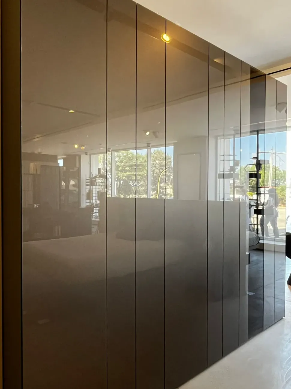- Fasce frontali: vetro lucido piombo metal con inserti in vetro lucido fumé bronzo, personalizzabili singolarmente per creare infiniti mood cromatici