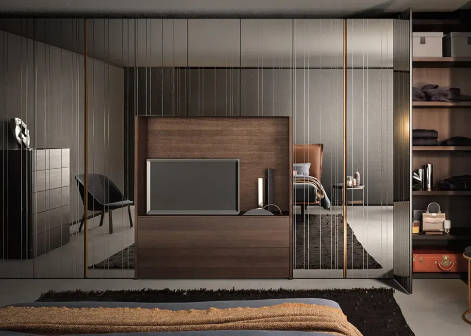 Lussuosa, eccentrica ed elegante, la decorazione diventa protagonista. A catturare lo sguardo sono le incisioni verticali che percorrono la superficie dell anta, alternandosi come raggi discontinui e disegnando dinamici motivi paralleli. Lucide o opache, impreziosiscono i vetri e gli specchi delle ante. Le maniglie sono ricavate a tutta altezza all interno dell anta e sono realizzate in alluminio laccato o con finitura metallizzata. Armadio su misura dalla massima libertà progettuale dalle molteplici finiture