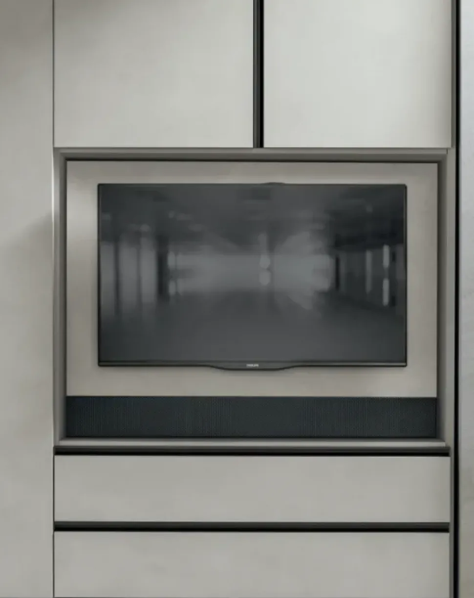 Il porta TV è integrato nell’armadio: il pannello porta TV si apre e si scopre un utilissimo vano per contenere altri apparecchi tecnologici.
