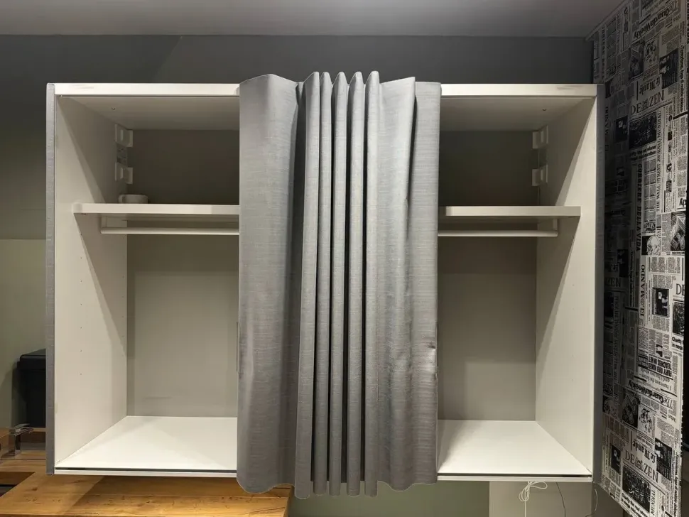 Un tessuto teso di grandi dimensioni sostituisce le ante eliminando la percezione dell’armadio, che diventa una raffinata parete tessile.