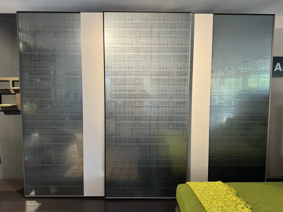 FRAME È UN ARMADIO CON ANTA SCORREVOLE CHE ABBINA DUE FINITURE A CONTRASTO. DISPONIBILE CON VETRO SERIGRAFATO E FASCIA LACCATO OPACO TORTORA.