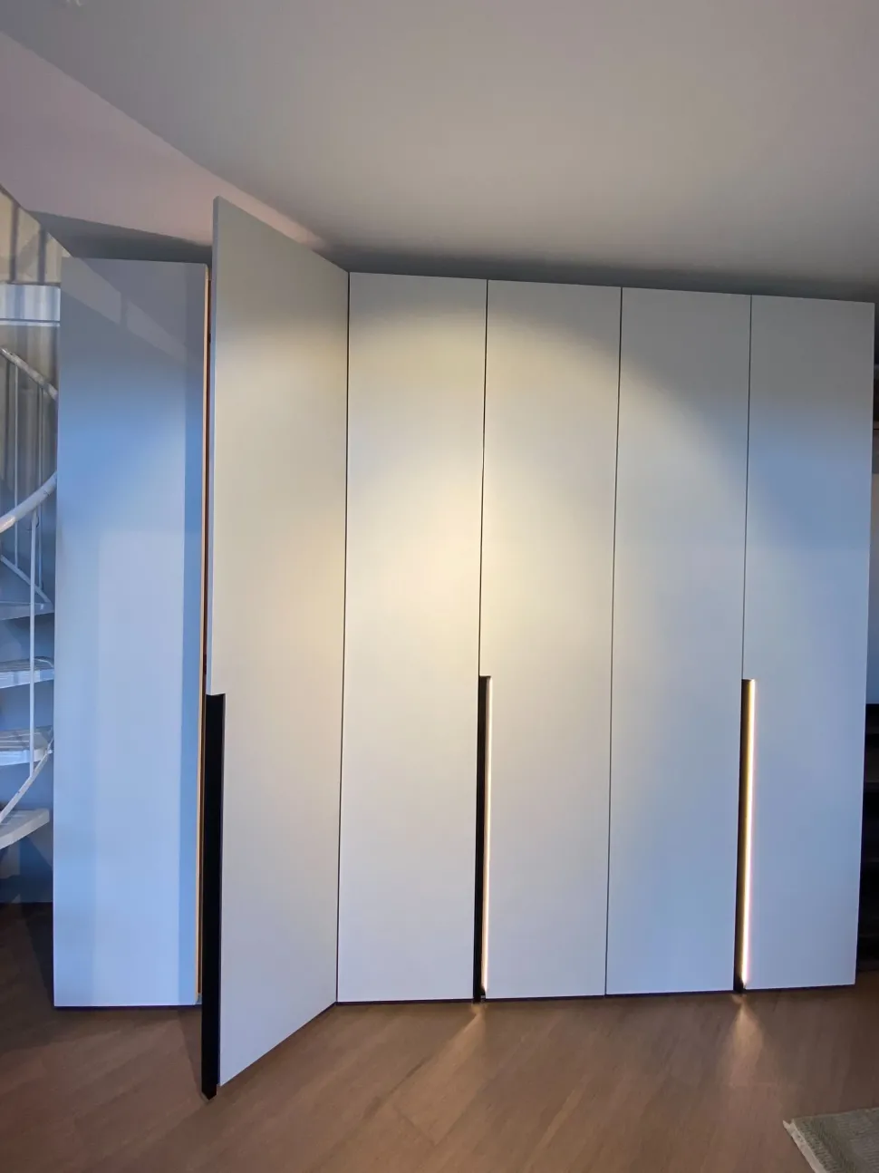 Gioco di colori e profondità per le ante battenti Tratto, con un effetto di contrasto cromatico fra la superficie esterna, la maniglia e il fondo della fascia.