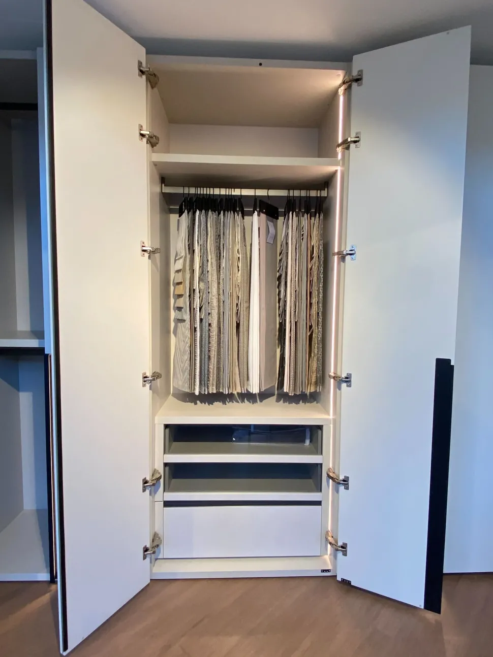 Le ante dell armadio e la struttura all esterno sono in laccato opaco finitura magnolia, mentre la struttura interna dell armadio è in materico lino tramato. I dettagli delle attrezzature interne sono in piombo metal (tubi appendiabiti, struttura portapantaloni, profili gole).