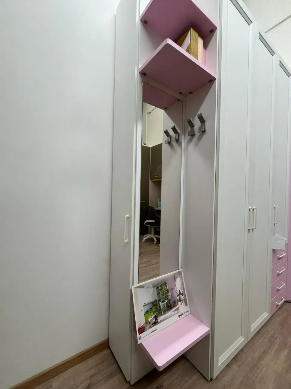 Cabina armadio, modulo armadio con cassettiera interna e terminale con anta laterale con ripiani all’interno.