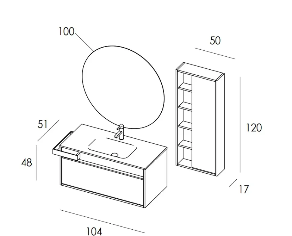Questa splendida composizione mod. Duetto 04 include un mobile arredo bagno L.104 x p.51 x h.48cm. con portaasciugamani e un grande specchio retroilluminato mod. Bubble di cm.100 di diametro, oltre ad una colonna pensile di misure L.50 x p.17 x h.120cm. con un’anta e zona a giorno.