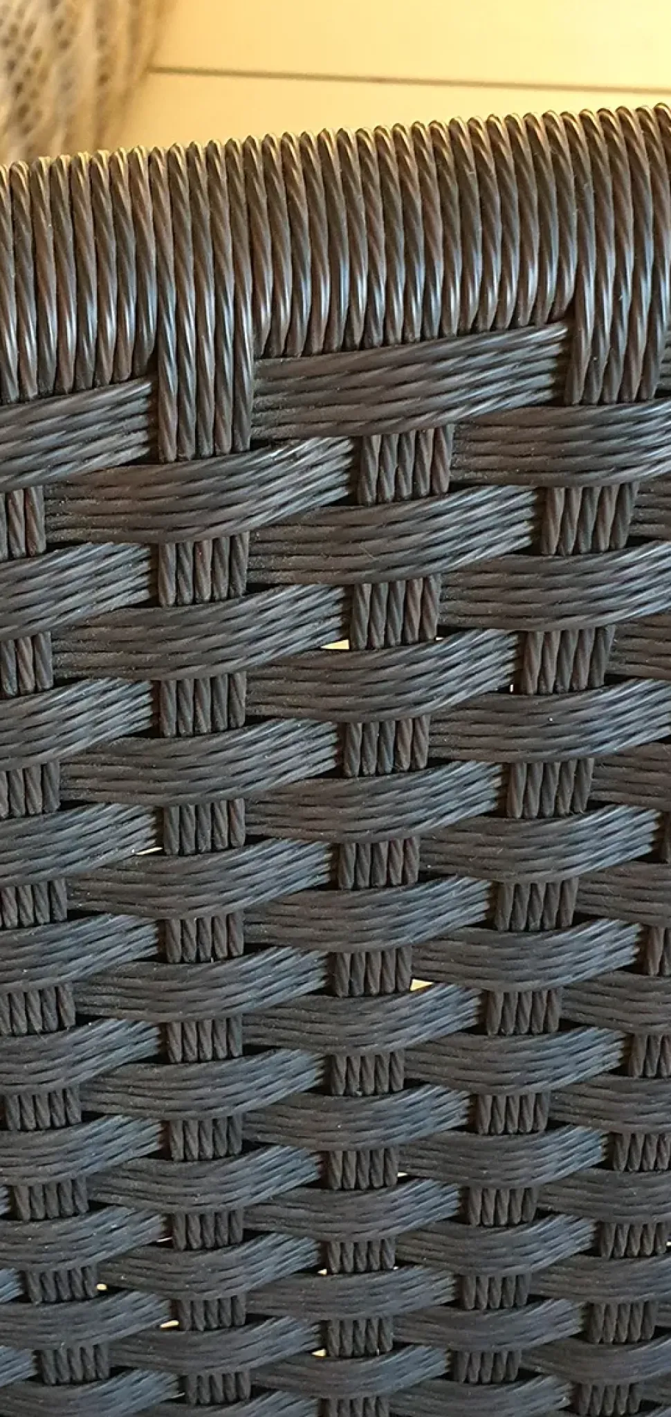 Questa poltrona da pranzo da esterno dal design moderno ha una struttura in alluminio avvolta da un intreccio con un motivo a spina di pesce in resina CosXXS® nella colorazione fondente.