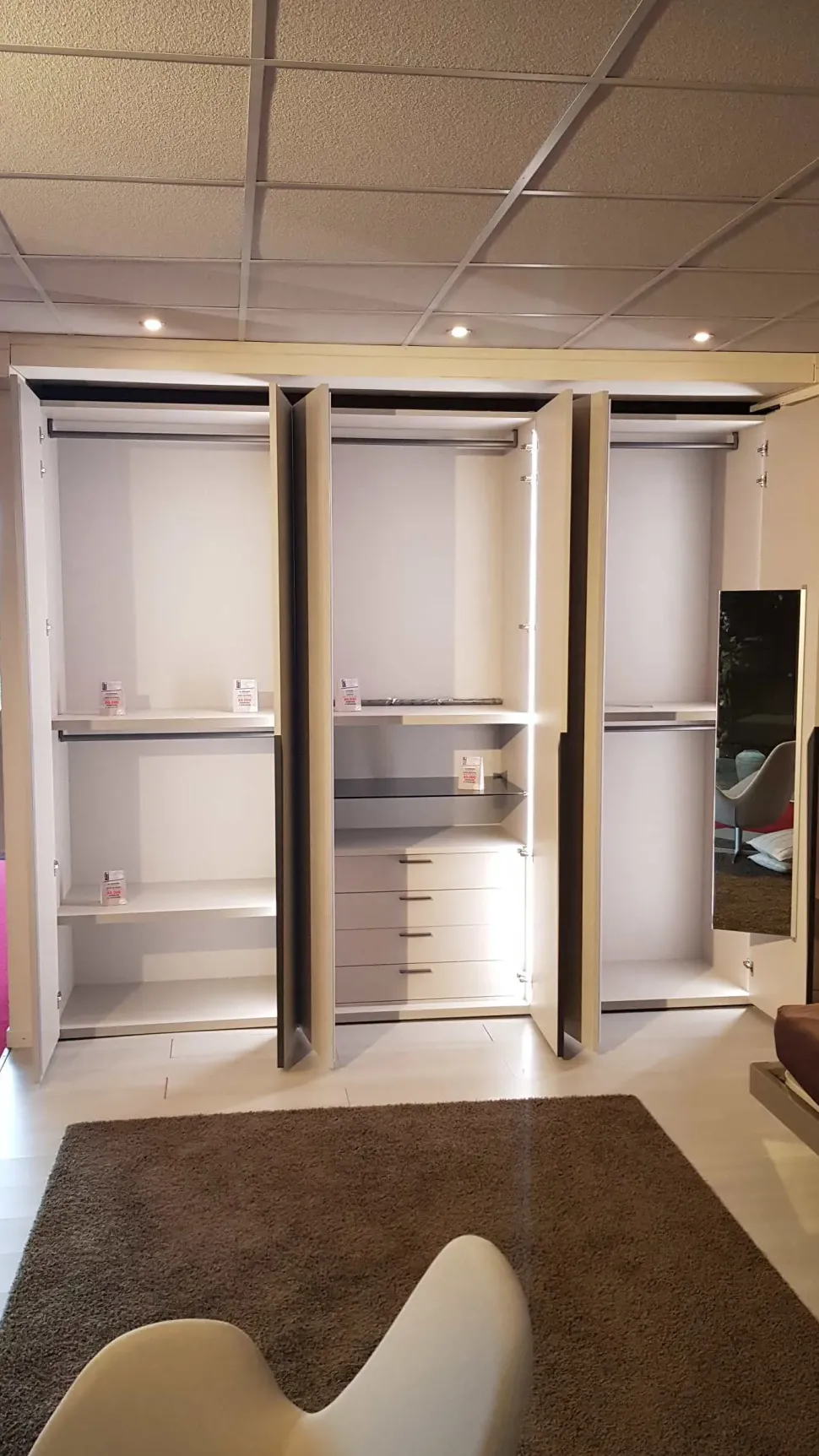 Attrezzatura interna : cassettiera con guide a rientro ammortizzato, specchio orientabile, luci a led verticali con sensore di presenza, ripiani in legno, ripiano in vetro fumè trasparente, cerniere con apertura a 180°nel vano centrale.