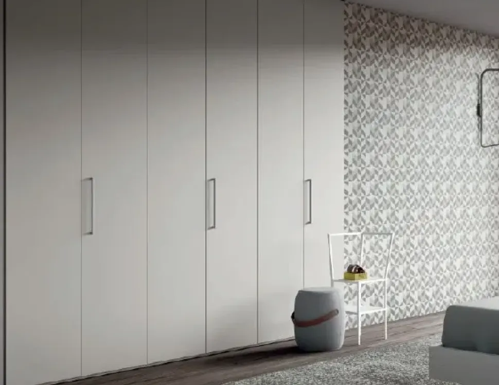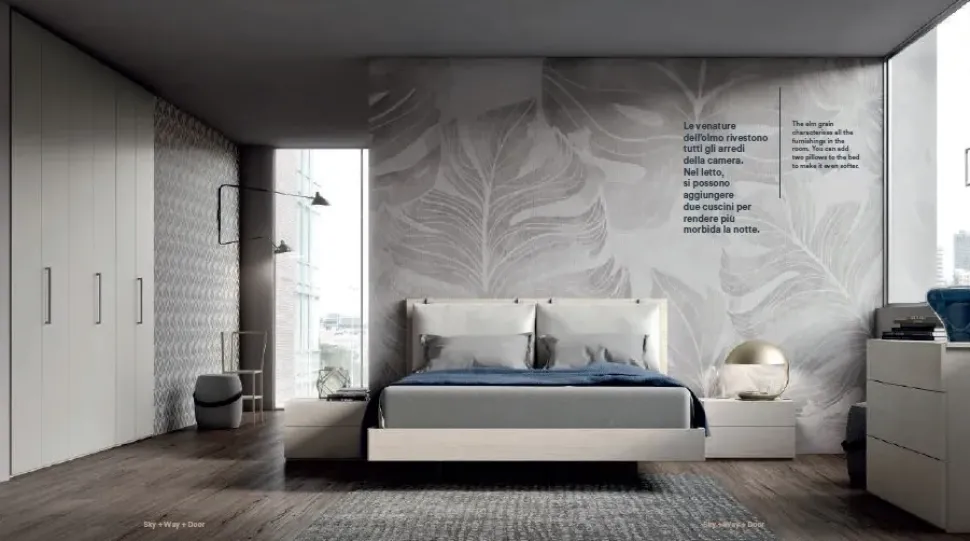 Letto SKY giroletto sospeso, cuscini in ecopelle, 2 comodini 1 comò WAY 1 armadio battente con 6 ante DOOR con 6 tubi appendiabiti e 3 ripiani interni SP 3 cm. Battuta parapolvere e chiusura rallentata sull’armadio in ogni singola anta. Tutti i cassetti sono dotati di guide con chiusura rallentata.