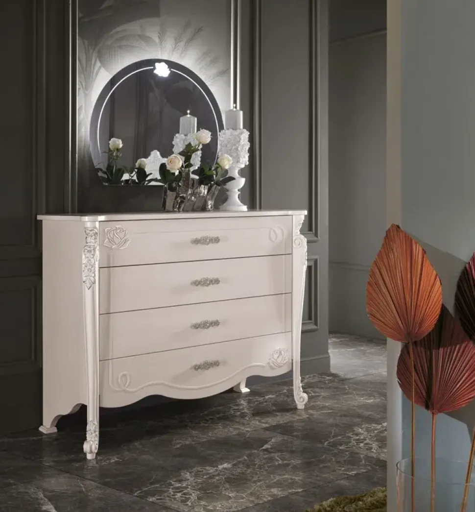 La camera da letto rappresenta un vero e proprio luogo dell’anima, l’ambiente in cui dire addio alla formalità della vita pubblica e rintanarti dedicandoti al meritato riposo. Per questa ragione la scelta dello stile è fondamentale: deve farti sentire a tuo agio e garantirti il massimo comfort possibile. Camera matrimoniale completa stile classico modello Stella. Letto matrimoniale con testata imbottita, contenitore interno, stile classico con piedini sagomati e rifiniture. Ha una lunghezza di 182cm, profondità 212cm, altezza 156cm. Nello stesso stile, comodino a tre cassetti con guide ammortizzate, comò a quattro cassetti ammortizzati dove risalta la specchiera tonda con luce a Led integrata. A concludere armadio ad ante scorrevoli in legno, con ripiani interni, appendiabiti e quattro cassetti. A risaltare, set specchi sagomati con decoro nelle ante. Lunghezza 276cm, profondità 65cm, altezza 247cm. Consegna compresa nel prezzo, 30-40 giorni lavorativi. La nostra offerta per questa camera matrimoniale è di euro 5900,00. Per maggiori informazioni contattaci via mail o passa nel nostro showroom.