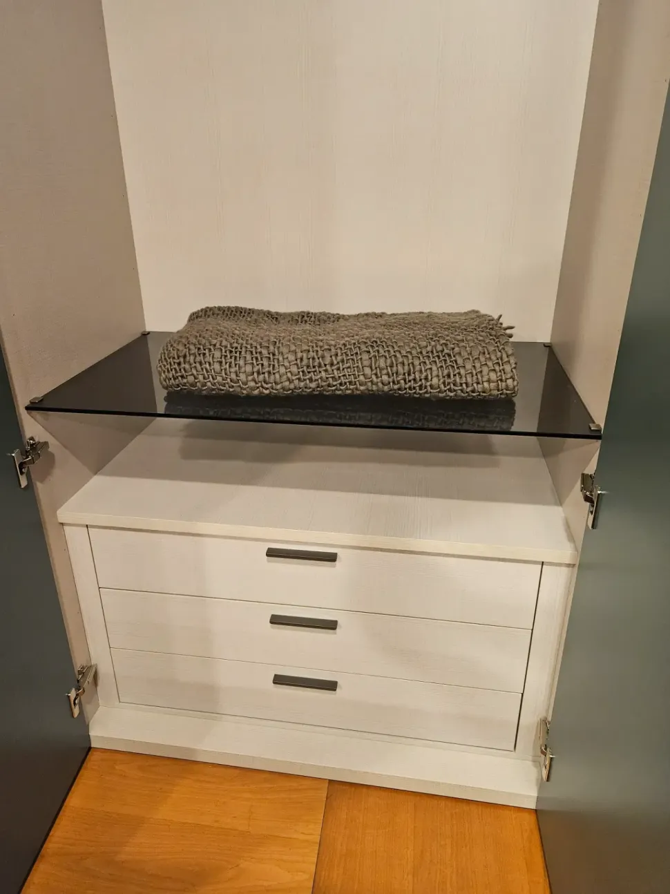 - Attrezzato internamente con una cassettiera intera e un ripiano di vetro fumé