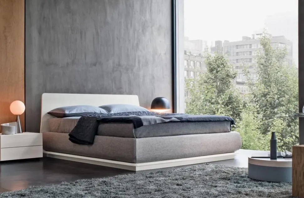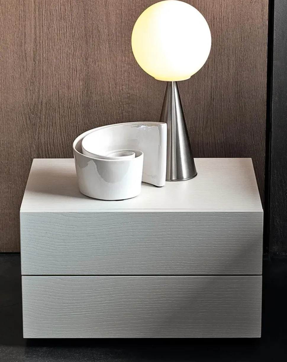 Letto Charme con contenitore in legno laccato a poro aperto completo di rete ortopedica 160×200 + 1 comò e 2 comodini Cube 45.