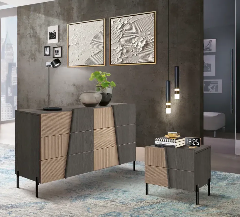 Aggiungete un tocco di design moderno e sofisticato alla vostra camera da letto con questo elegante gruppo composto da comò e comodini in legno di frassino. Realizzati con cura e attenzione ai dettagli, questi mobili presentano linee contemporanee e una combinazione di finiture naturali che si adatta perfettamente a diversi stili di arredamento.