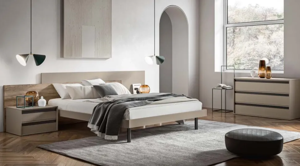 La composizione GL-18 ti offre una camera completa, composta da il letto Turca_106, gruppo Luce, e comodino Roby. Il letto Turca con 4 gambe in legno presenta un giroletto nella finitura Beige, con testiera Ravel in legno, composta da due pannelli nelle colorazioni: cannella e beige; angolari di raccordo in legno massello verniciati in tinta. Il gruppo Luce è composto da comò e comodino nella finitura Beige con piedini regolabili, presentano una struttura a cassetti frontali con chiusura soft-closing e maniglie Gola verniciate nero. Il comodino a giorno Roby nella finitura Rockwood Cannella, realizzato in pannello melnaminico.