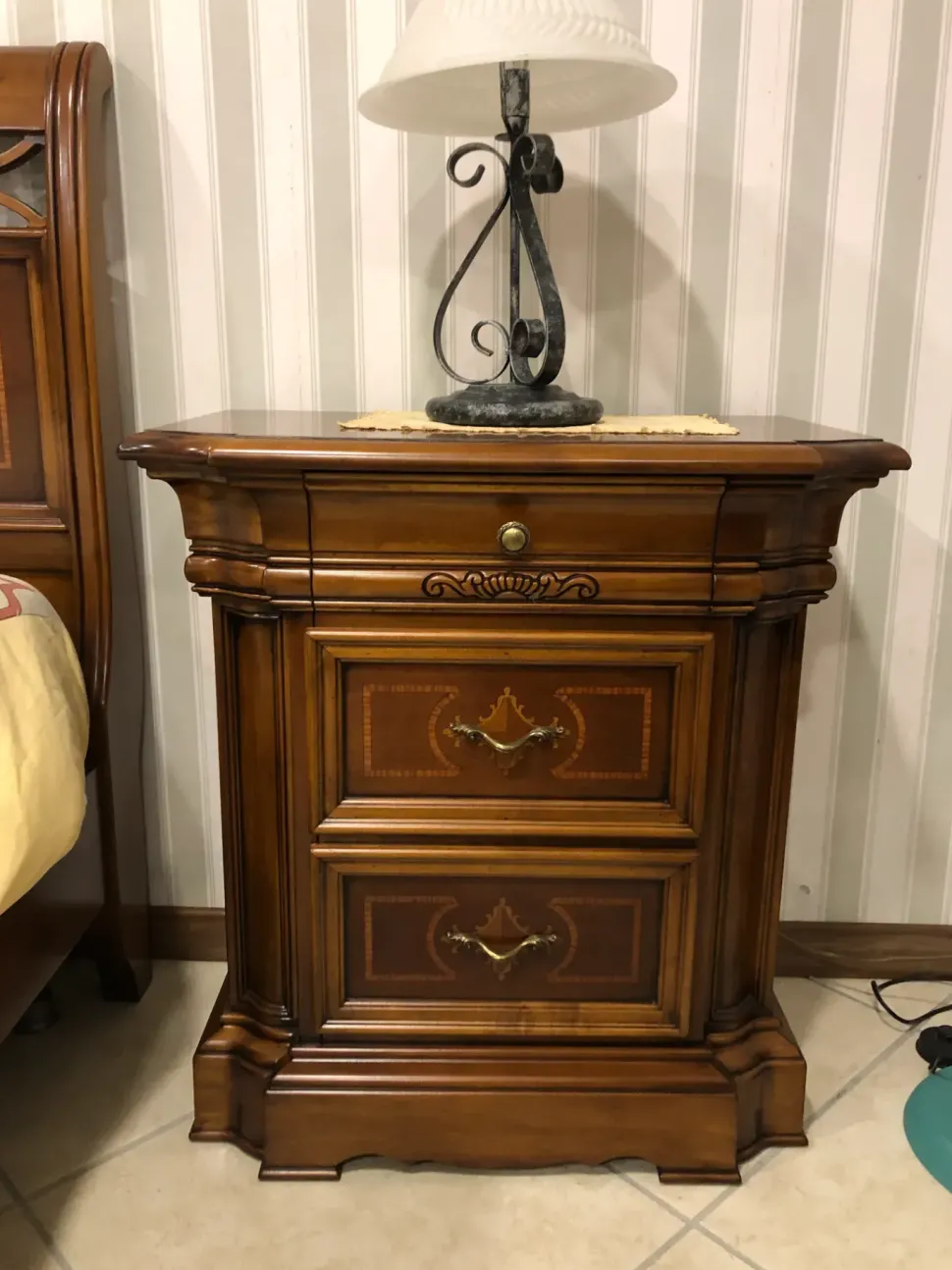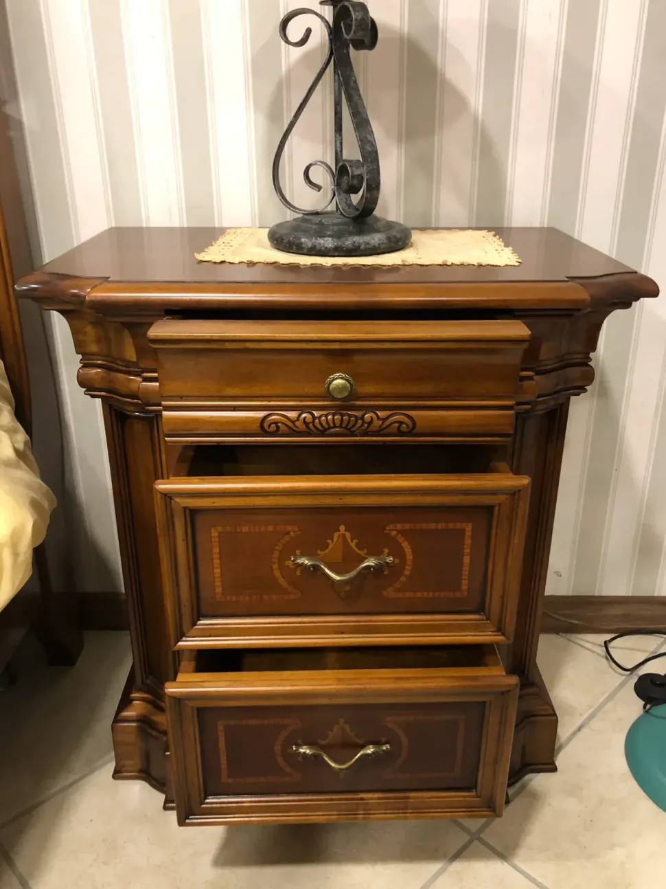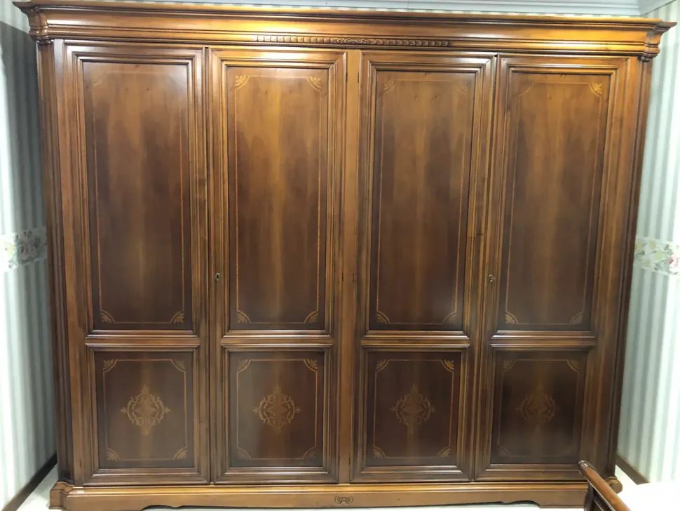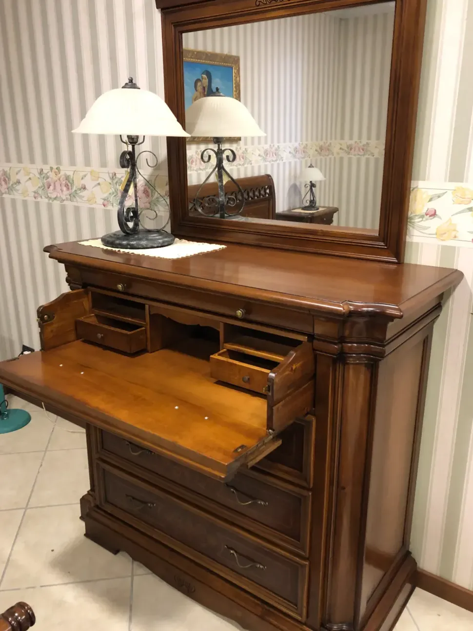 Il comò composto da 4 cassetti tutti rigorosamente intarsiati risulta l’elemento di prestigio della camera da letto. Oltre ai 4 cassetti, ne ritroviamo un quinto, nascosto nella parte superiore, che è un comodo portagioie, è l’elemento di prestigio di questa camera da letto. I comodini composti da 2 cassetti, anch’essi con medesime intarsi i, sono dotati di cassettino superiore. Le sponde di tutti i cassetti sono in legno con incastro a coda di rondine. Miusra comò L133cm-P65cm-H116cm misura comodino L69cm-P40cm-H74cm.La specchiera rimane fedele, rettangolare che mantiene le stesse linee classiche dell’intera camera.