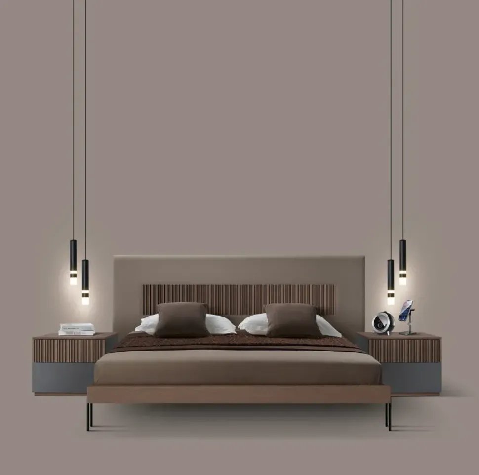 Gruppo Letto in Noce Tanganika con Dettagli in Frassino e Testata Imbottita