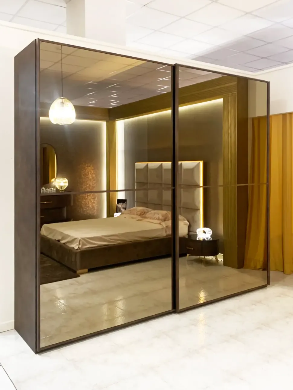 Armadio Incanto con 2 ante scorrevoli con cassettiera interna a 4 cassetti, finitura effetto pelle primo fiore e specchi bronzo L.277,5 P.70 H.250.