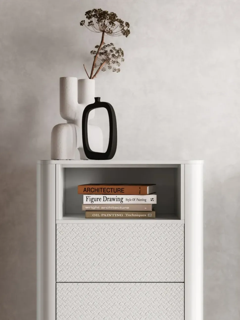 L’arredamento minimalista e luminoso crea un’atmosfera rilassante e accogliente, perfetta per chi cerca un ambiente tranquillo per riposare. La combinazione di colori neutri e linee pulite conferisce un tocco moderno e elegante a questa stanza. Camera matrimoniale completa di letto modello Lavinia (160×200) imbottito base a terra con giroletto Epsilon imbottito in tecnopelle E407 con inserti in tecnopelle E402. Il design del letto è elegante, con linee pulite e una testiera imbottita che aggiunge un tocco di lusso. Gruppo notte modello Lovi in laccato opaco Bianco e laccato opaco Bianco Intreccio, composto da due comodini di design con basamento centrale in metallo e due settimanali a cinque cassetti e vano a giorno. Rete a doghe compresa. Consegna compresa nel prezzo, 40 giorni lavorativi. La nostra offerta per questa composizione è di euro 5000,00. Per maggiori informazioni contattaci via mail o passa nel nostro showroom.