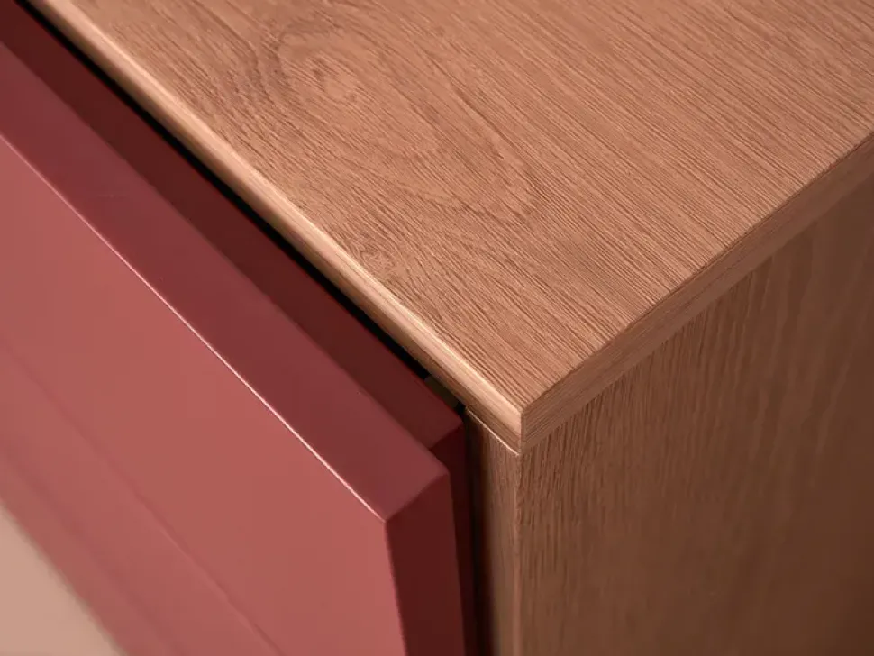 Anta con finitura laccato prugna all’acqua antigraffio , con profilo maniglia gola e finitura colore caldo chiaro.