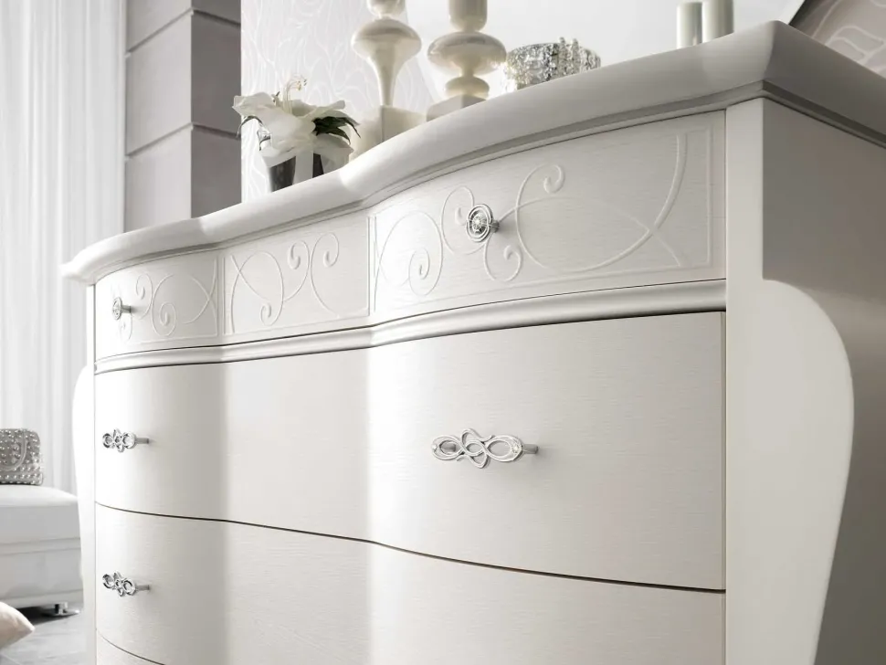 - Tra i materiali pregiati che la marca ha scelto per la sua linea di arredi per la camera da letto, non mancherà per certo il legno con cui questo modello Camera completa luxury frassino bianco è stato realizzato, materiale appropriato per trovare soluzioni alle necessità di praticità ed estetica di ciascuno; design unico, resistenza nel tempo e robustezza strutturale sono garantiti in questa proposta di grande qualità, poiché è realizzata seguendo una peculiare coerenza stilistica.