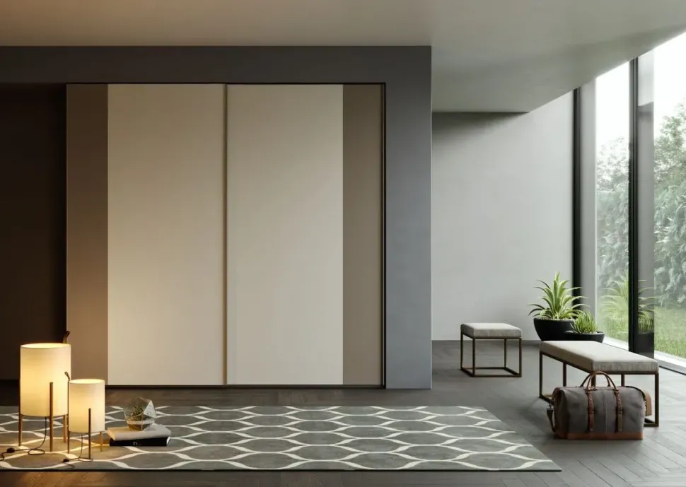 Gli accessori interni sono una cassettiera a tre cassetti con maniglioni circolari, tre ripiani e due bastoni appendi abiti. E’ possibile la scelta dei colori.