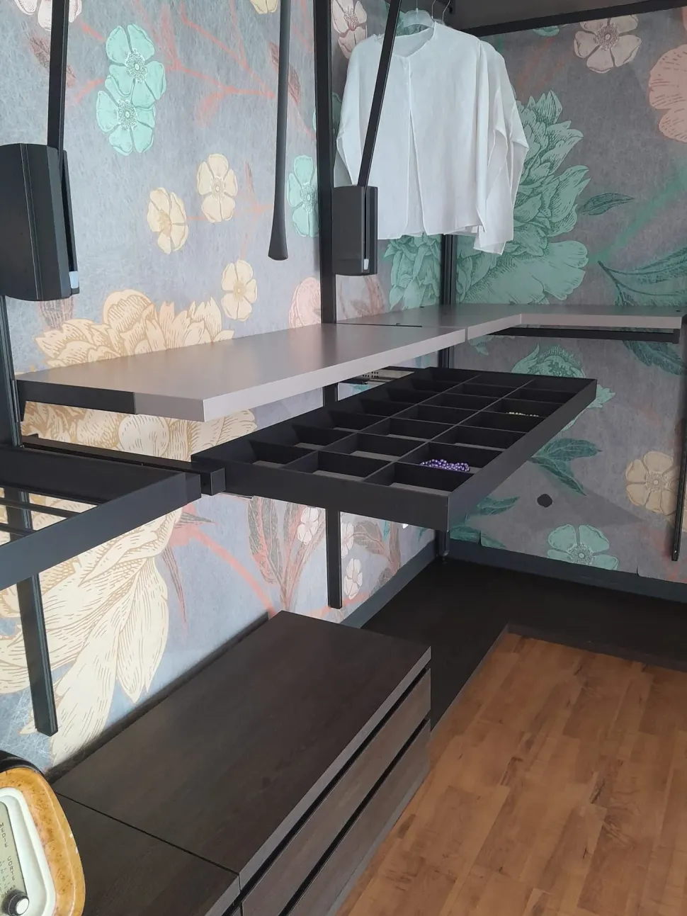 Dotata di illuminazione LED, porta cinture estraibile, appendiabiti saliscendi, porta pantaloni estraibile, vano armadio chiuso con ante vetro garzato bronzo