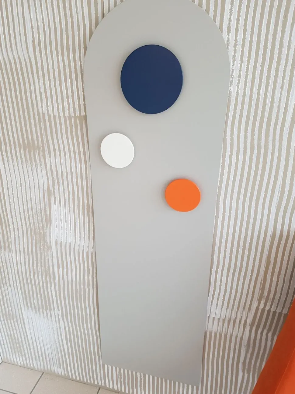 La composizione si completa con un pannello sagomato bicolore a muro e con l’originale scrittoio Jerry a forma di nota con gamba thube.