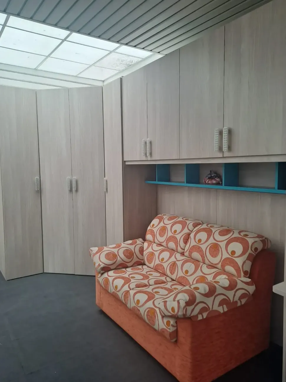 Composizione a ponte con aggiunta di mobile angolocabina spogliatoio e scrittoio.