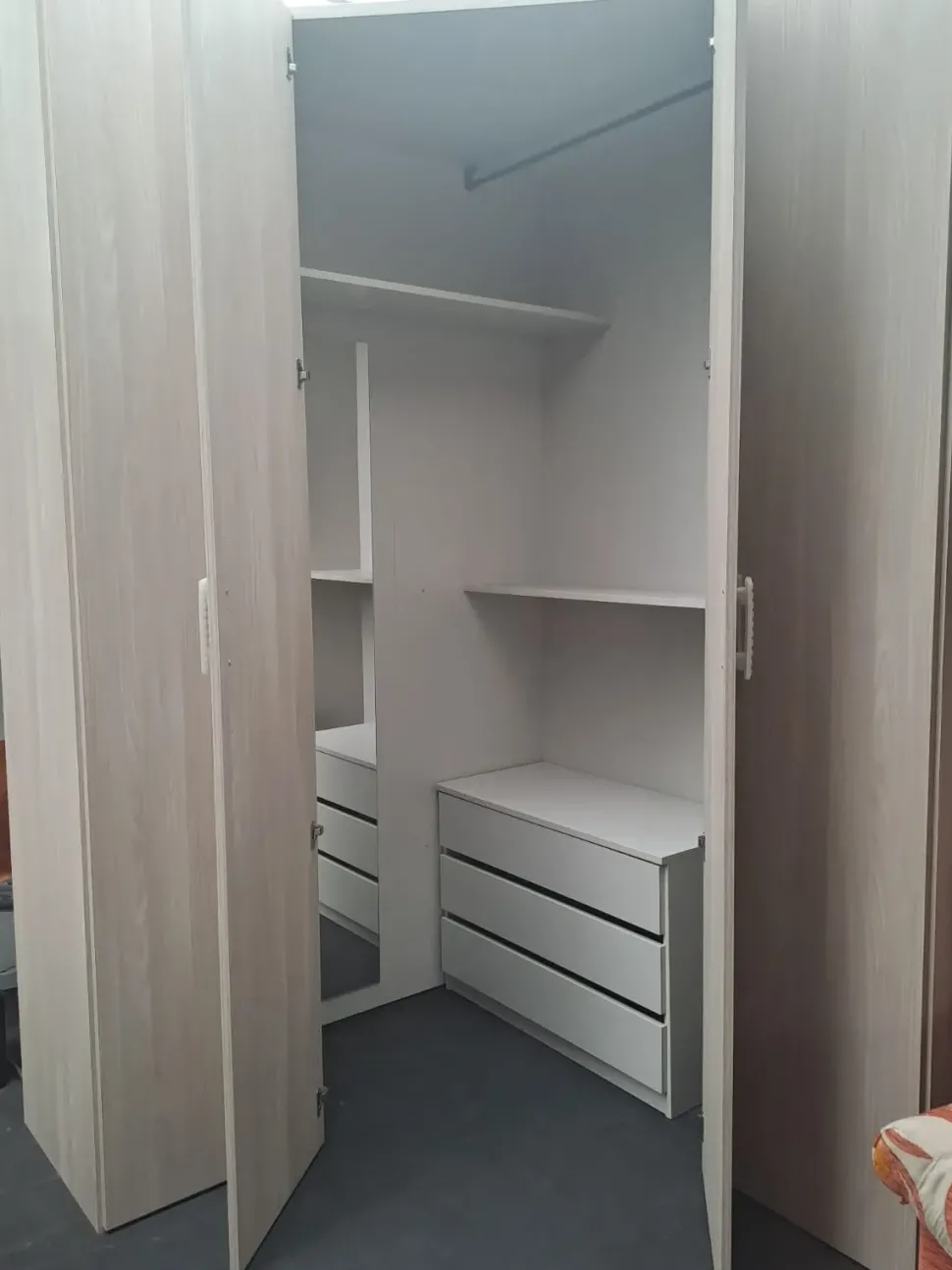 Ampia cabina angolare corredata di specchio interno e cassettiera.