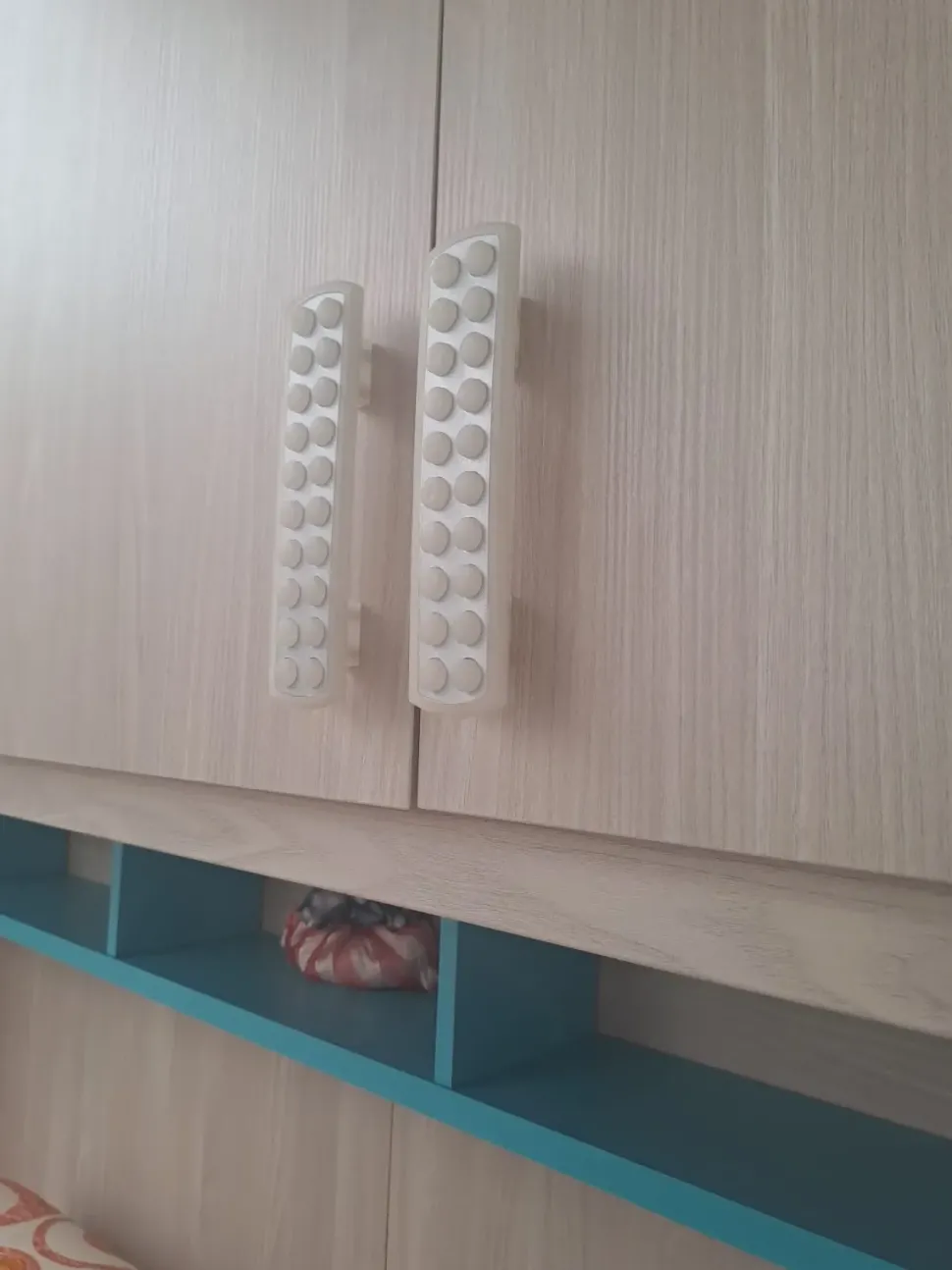Finitura olmo e celeste opaco, simpatica maniglia lego in policarbonato trasparente.