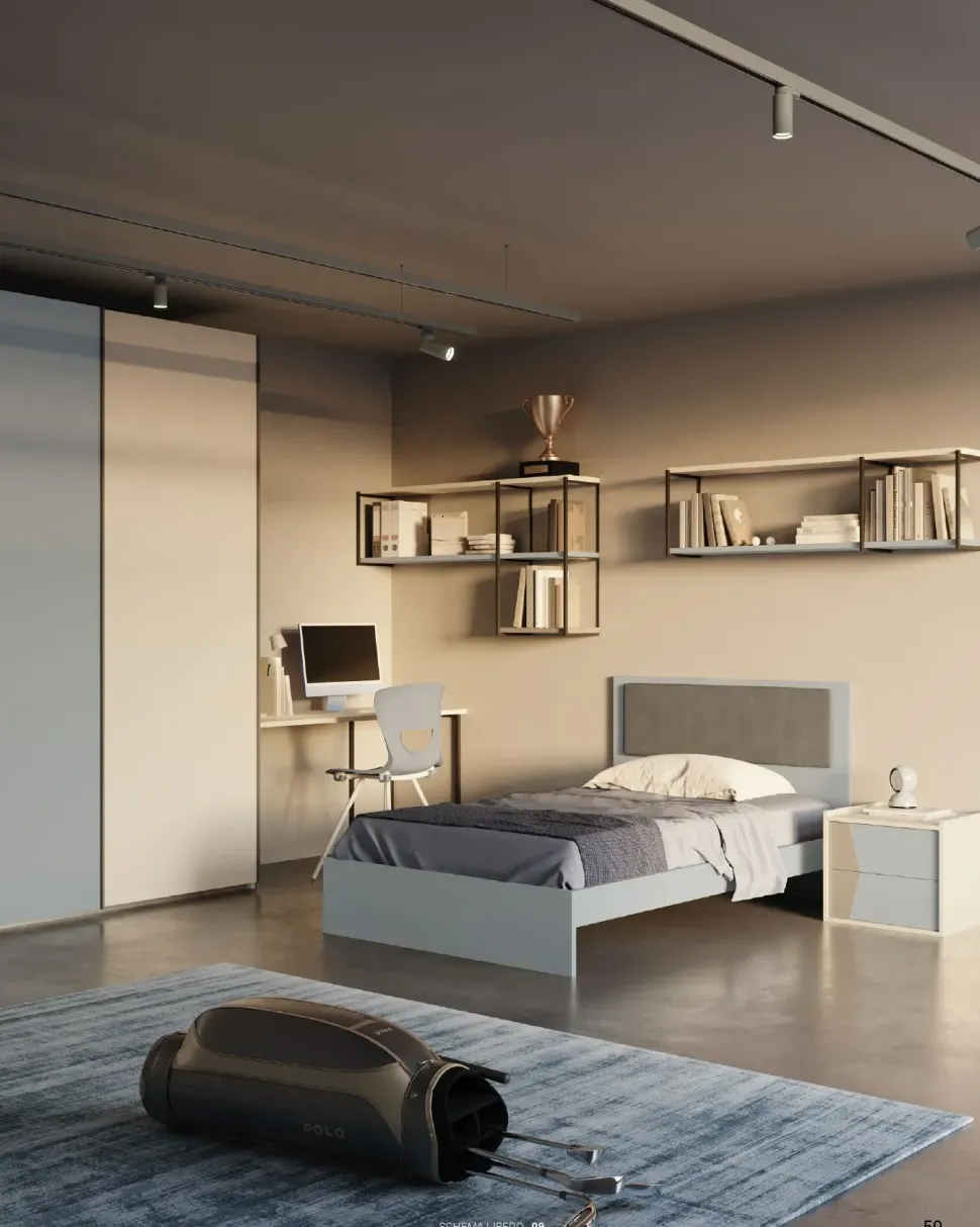 Questa cameretta si distingue per il suo design geometrico e moderno, caratterizzato da linee pulite e una combinazione di materiali che conferiscono un aspetto contemporaneo e stilisticamente audace. Ogni elemento dell’arredo è progettato per unire funzionalità ed estetica, offrendo un ambiente elegante, organizzato e allo stesso tempo versatile. Il letto è perfettamente integrato nello spazio, con una struttura che enfatizza l’aspetto geometrico. La base del letto aggiunge una sensazione di solidità e modernità, mentre la testiera in materiale coordinato completa il look, mantenendo un’armonia visiva con gli altri arredi. Il comò a due cassetti, garantisce un’ottima organizzazione senza rinunciare a uno stile raffinato. La scrivania con una superficie ampia e funzionale, supportata da una struttura in metallo, offre spazio sufficiente per computer, libri e materiali di lavoro. La struttura in metallo aggiunge un tocco industrial, creando un contrasto elegante con il resto della stanza. I pensili, anch’essi con una struttura in metallo, sono dotati di ripiani regolabili che permettono di personalizzare lo spazio di archiviazione in base alle proprie esigenze. Il grande armadio, con ante scorrevoli, offre all’interno una vasta capacità con ripiani, appendiabiti e vano a vista, il tutto perfettamente organizzato per garantire facilità d’uso e accessibilità. La personalizzazione delle finiture è compresa nel prezzo. Spedizione in tutta Italia senza costi aggiuntivi, 30-40 giorni lavorativi. L’offerta per la cameretta è di euro 3.480. Approfitta dello sconto e passa a trovarci nel nostro showroom oppure contattaci via mail per maggiori informazioni o preventivi.