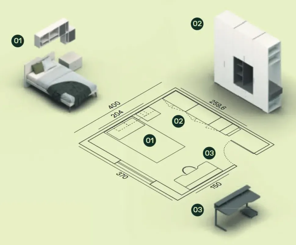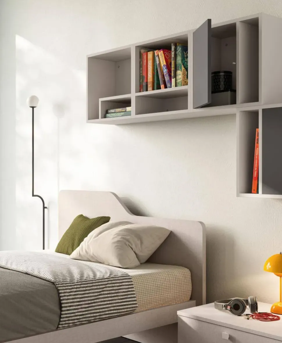 Letto Game con giroletto Alfa in finitura Dekor Cotone e piede Conico in finitura Lavagna, comodino in finitura Dekor Cotone. Casellari Ram in finitura Velluto con anta in finitura Lavagna.