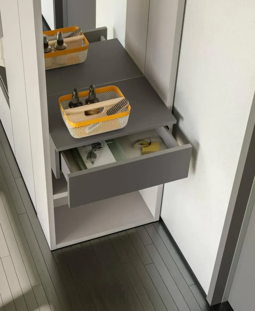 Armadio battente con anta Liscia in finitura Velluto con vano a giorno con tubo appendiabiti. Maniglia T76. Elemento terminale con cassetto e specchio in finitura Velluto e Lavagna.