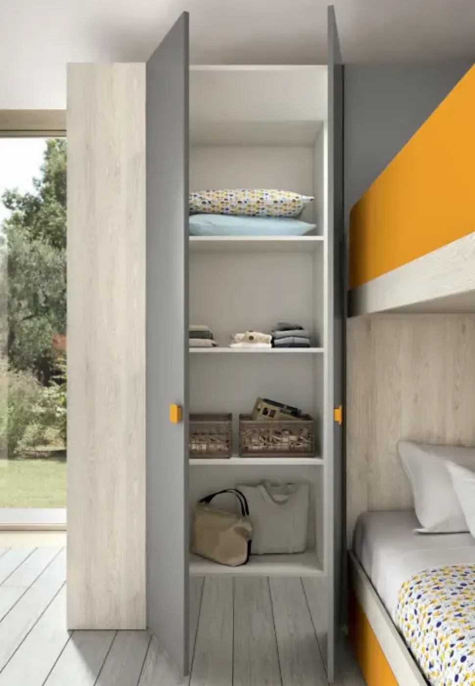 Nel mondo di camerette per la generazione Alpha, la vitalità dei colori, la novità dei materiali e la vibrazione giocosa degli elementi rendono ogni spazio unico ed accogliente. Un ambiente vivace e stimolante, dove il gioco e lo studio si fondono in un’unica esperienza educativa. Camera con letto a castello maxi, completo di scaletta con gradino a scomparsa, un elemento pratico, che quando non viene utilizzato si integra perfettamente nella struttura della scaletta senza ingombrare. Una volta estratto, rivela un comodo vano contenitore ideale per riporre. Ha una lunghezza totale di 266cm, profondità 172cm, altezza 259cm. Integrata all’area riposo, la cabina box con ante battenti, una soluzione ideale per ottimizzare lo spazio a disposizione. Appendiabiti e tanti ripiani di diverse misure, offrono una flessibilità senza pari per organizzare vestiti, scarpe e accessori. La cabina ha una lunghezza di 229cm, altezza 259cm. La libreria terminale, un tocco di stile e funzionalità per l’armadio guardaroba. Questo elemento aggiuntivo è perfetto per sfruttare al meglio ogni centimetro disponibile, con una vasta gamma di finiture e colori. A completare la camera, scrittoio doppio forma a L, poltroncine regolabili in altezza e una cassettiera mobile. Un angolo ideale per lo studio e la creatività, integrato con pensile cubotto e mensole sospese per aggiungere spazio di archiviazione. Larghezza dello scrittoio 180cm, altezza 75cm. Rete inclusa. Escluso invece il materasso. Personalizzazione delle finiture senza variazione di prezzo. Consegna compresa nel prezzo, 30-40 giorni lavorativi. L’offerta per questa cameretta è di euro 4400,00. Per maggiori informazioni contattaci via mail o passa a trovarci nel nostro showroom.