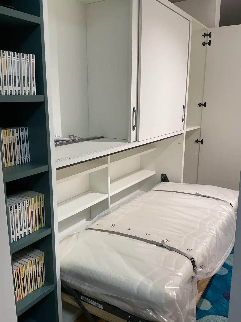 Blocco a scomparsa L. 295 x H. 232 x P. 60. Completo di scrivania , ponte scorrevole modulo L. 60 e Libreria a giorno