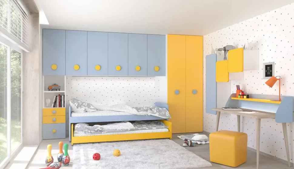 Sono molteplici le soluzioni componibili di ” LINEA IN ARREDAMENTI ” dal nuovo design e finiture di colori vari per arredare la cameretta e creare un ambiente accogliente e armonioso. L’armadio a ponte con il letto scorrevole danno un tocco personale, attuale e confortevole a tutto l’arredo. E’ possibile acquistare separatamente i vari pezzi della composizione secondo le varie esigenze. E’ possibile completare/richiedere: – armadi con apertura ante battente/libro/scorrevole – librerie – specchiera – servetto saliscendi porta abiti – cesti estraibili – specchi interni E’ possibile modificare: – misure e componibilità della composizione – finiture con colori diversi – realizzazione anche “su misura” per armadi, librerie, mensole, pannellature Scheda informativa del prodotto di Qualita` MADE IN ITALY – strutture in laminato materico Classe E 1, sp.mm 18, – ante/cassetti in laminato materico Classe E 1, sp. mm 22, bordo ABS 4 lati, – cerniere in acciaio nichelato regolabili, dotate di sistema decelerante regolabile – ripiani interni spostabili – maniglie metallo laccato – finiture: Giallo, blu avio, bianco. LA COMPOSIZIONE COME FOTO COMPRENDE: Armadio a ponte, ante battenti completo di: – cassettiera esterna a 3 cassetti – 6 ripiani interni spostabili – 3 tubi inox appendiabiti – misure: L. cm 380 x P. 58 x H. 225 .Letto doppio scorrevole completo di: – reti con struttura in metallo verniciato a fuoco e pianale con doghe in legno – misure: L. cm 200 x P. – materassì esclusi. 3 Pensili L. cm 40 x P. 34 x H. 40/120 .Scrittoio – struttura in metallo laccato – top nobilitato melaminico Classe E 1 – misure: L. cm 120 x P. 60 – misure: L. cm 120 x P. 60