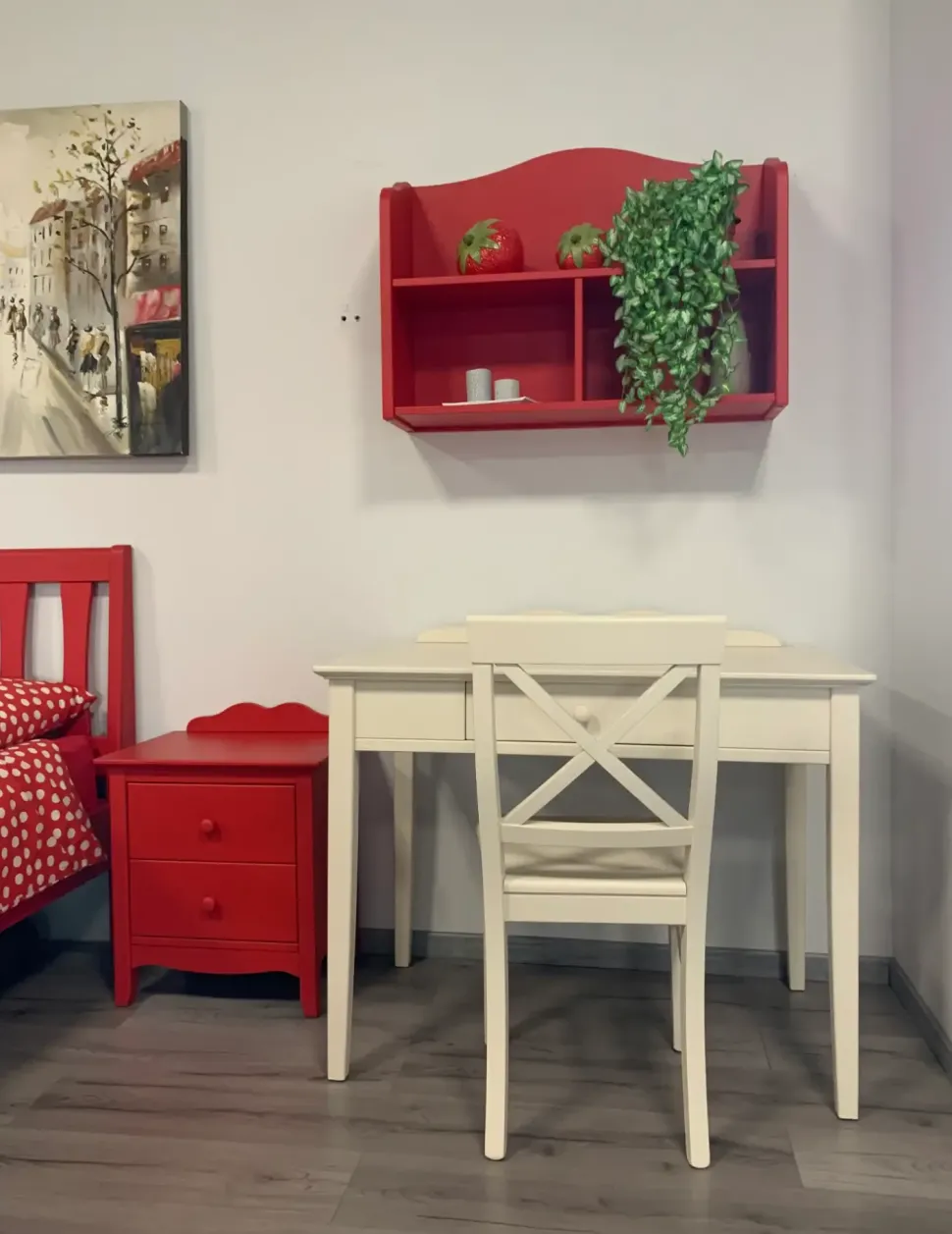 Cameretta in legno laccato. Proposta in laccato Perla e rosso papavero.