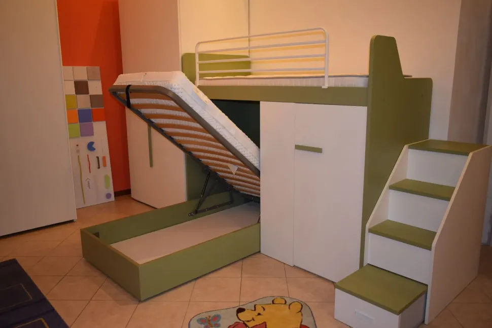 Dalla collezione Mottes Mobili, presentiamo la composizione Room 172. Il letto a castello è un idea perfetta per vivere la cameretta in modo originale e una soluzione efficiente per risparmiare spazio. La camera è composta da Rete list. letto castello + pannello in Salvia, Scaletta con contenitori in Bianco venato e Salvia, Schienale letto castello in Salvia, Cabina lineare con 2 ante in Rovere chiaro, Sommier Space contenitore singolo in Bianco venato, Elemento a giorno con schiena in Bianco venato. Ha una Larghezza di 370cm, Altezza 260cm. Trasporto in tutta Italia compreso nel prezzo. Approfitta dello sconto per ricevere questa fantastica cameretta a euro 2000,00. Per maggiori informazioni e preventivi contattaci via mail o passa nel nostro showroom.