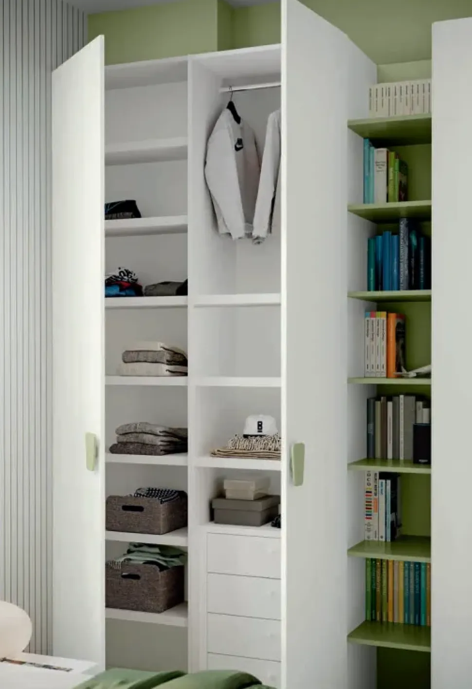- Questa cameretta comprende altresì un armadio ampio e durevole negli anni, pensato apposta per completare lo spazio junior fornendo a mamma e papà le doti contenitive di cui necessitano per il ricovero di capi di abbigliamento, complementi tessili o giochi; la cameretta qui visibile, difatti, comprende un armadio 4 ante capace di completare le doti di praticità del locale deputato ai più piccoli.
